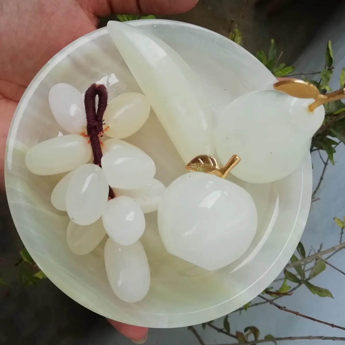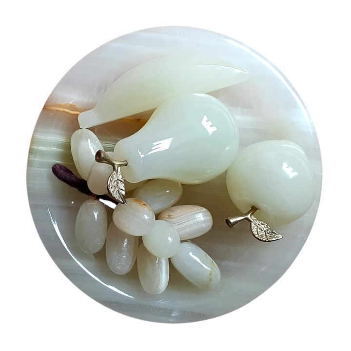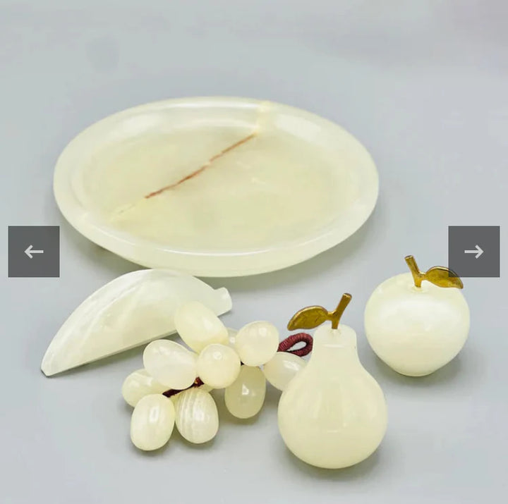 Marble Fruit Tray Set, Hand Crafted Decorative Onyx Round and Leaf Shape Tray with Marble fruits Grape Apple Banana and Pear