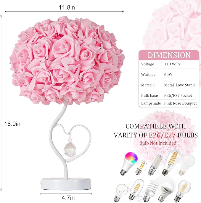 - E27 and Plug-in Cord: The rose flower desk lamp has an E27 lamp holder and it can be compatible with various incandescent, LED, or CFL bulbs. There is a switch button on the plug-in cord which is very convenient to turn on and off, not dimmable (Bulb not Included).