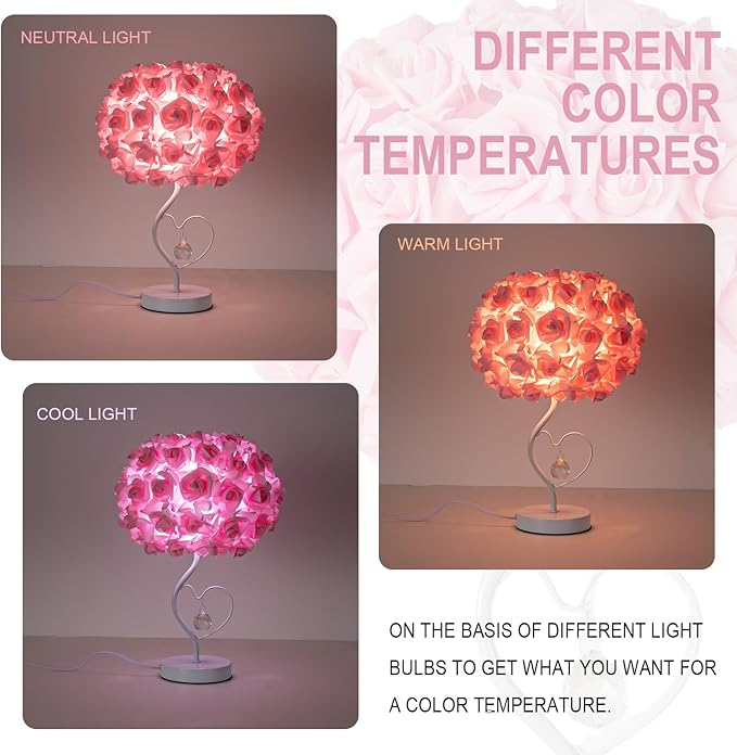 - Elegant and Modern Design: The love shaped rose table lamp is made of high-quality metal materials, and a handmade pink rose flower lampshade. The table lamp perfectly combines with the warm light of the lamp, creating a comfortable environment for reading, work and rest. Whether placed on the bedside table, on the side table of the study, or hidden in your favorite reading corner, this bedside lamp will brings a fashionable and romantic scenery to any sapce.